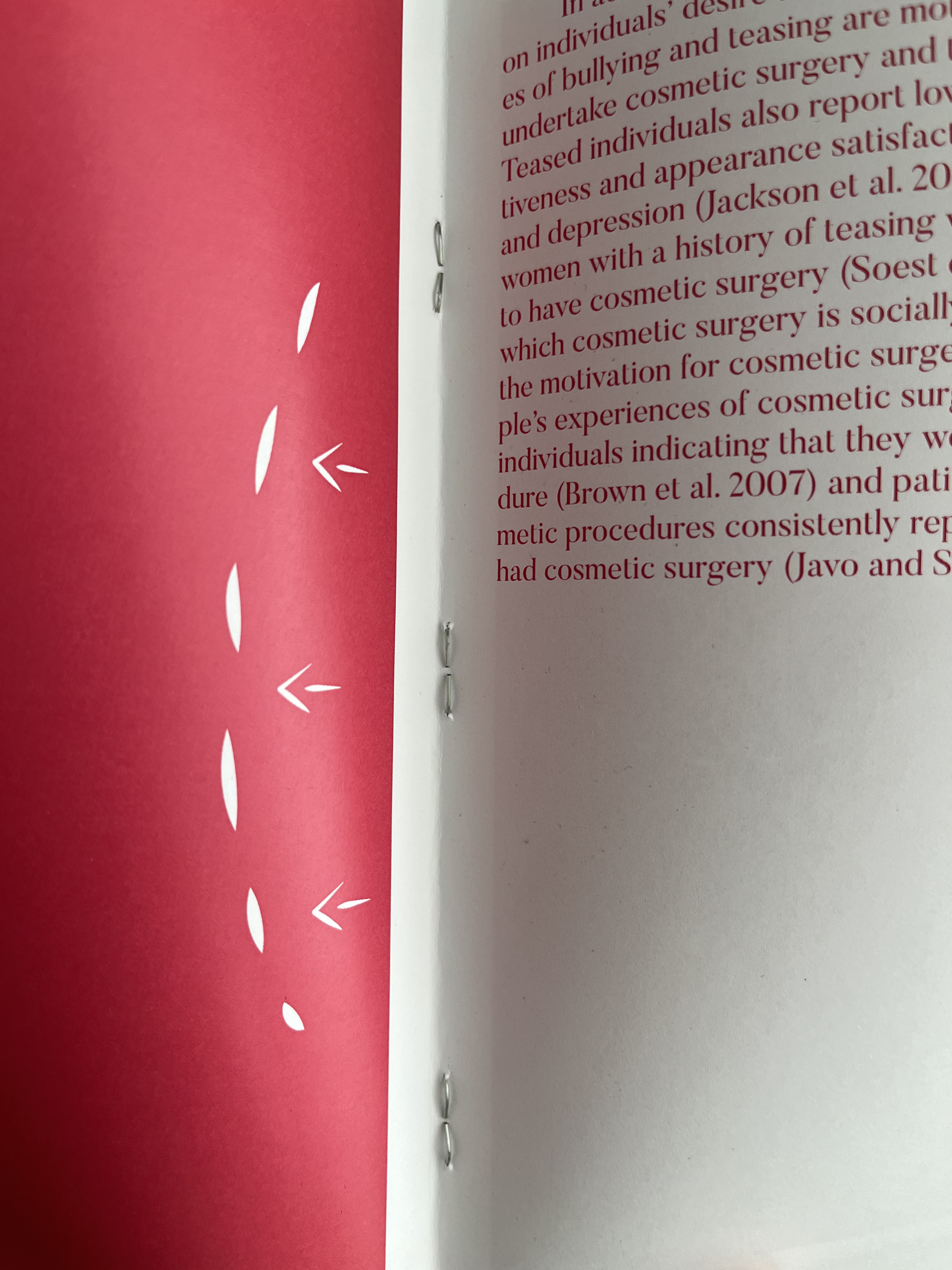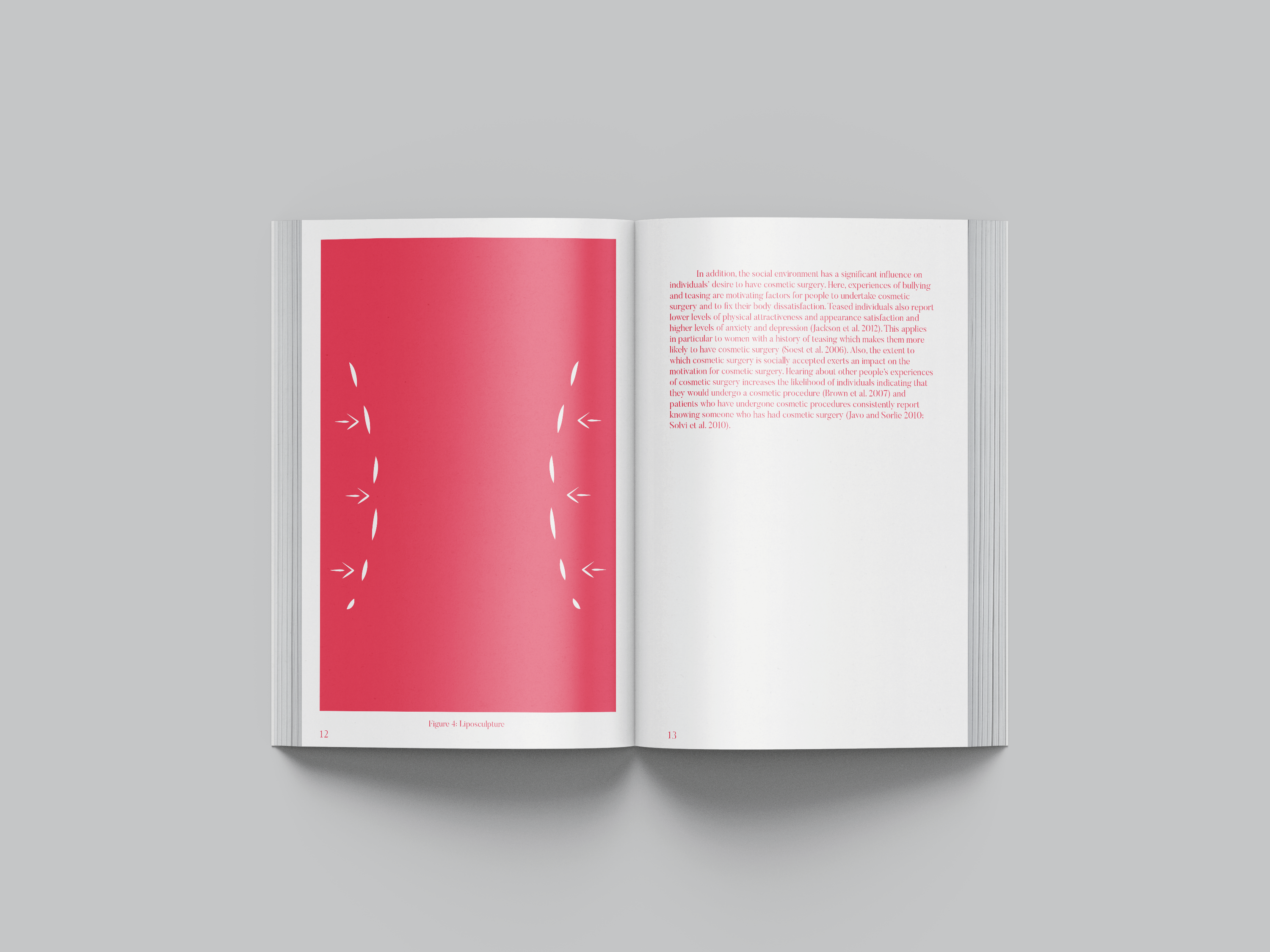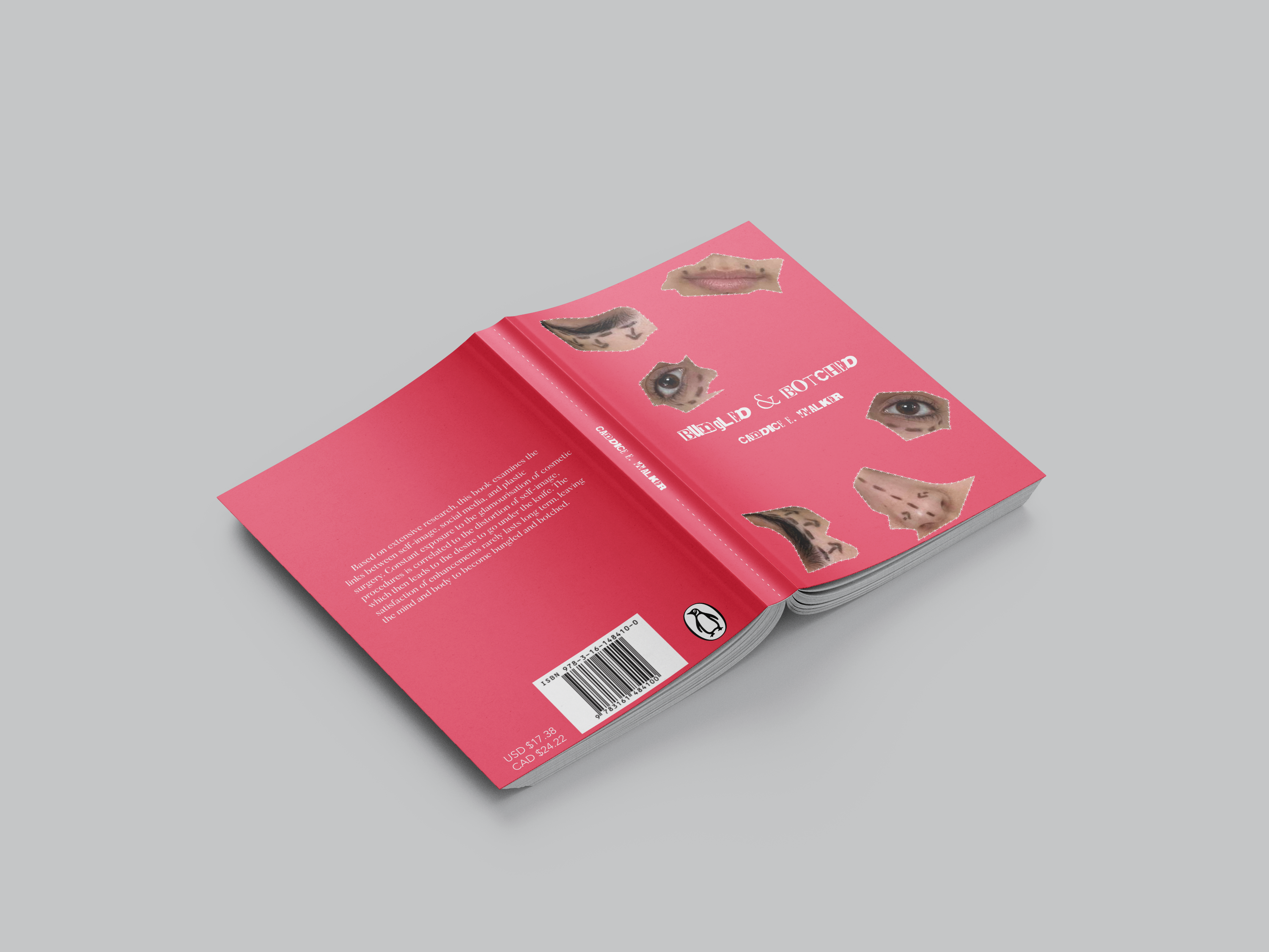 The overall aesthetic of the book, pink, white and serif text, is used to symbolize the false glamour of cosmetic procedures that are targeted towards young girls, while the title font represents different looking parts put together, like a face that has been fully reconstructed.